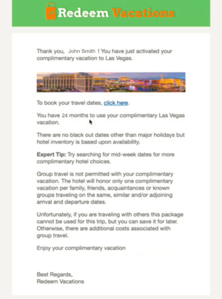 After submitting your information on this website, and choosing your vacation on the redeem.magnificentescapes.com website, you'll receive an email sent to the address you provided. This email will be sent by Redeem Vacations. Click on the link to activate your vacation.