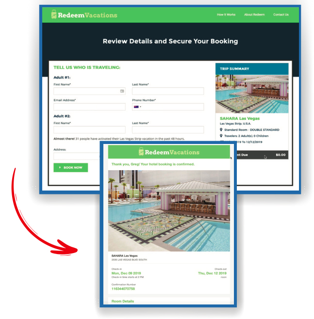 After you've secured the dates and accommodation that work for you, you may want to review your holiday to ensure everything is correct. To do this, revisit RedeemVacations.com and enter your email address and password given in your activation email to review the details.